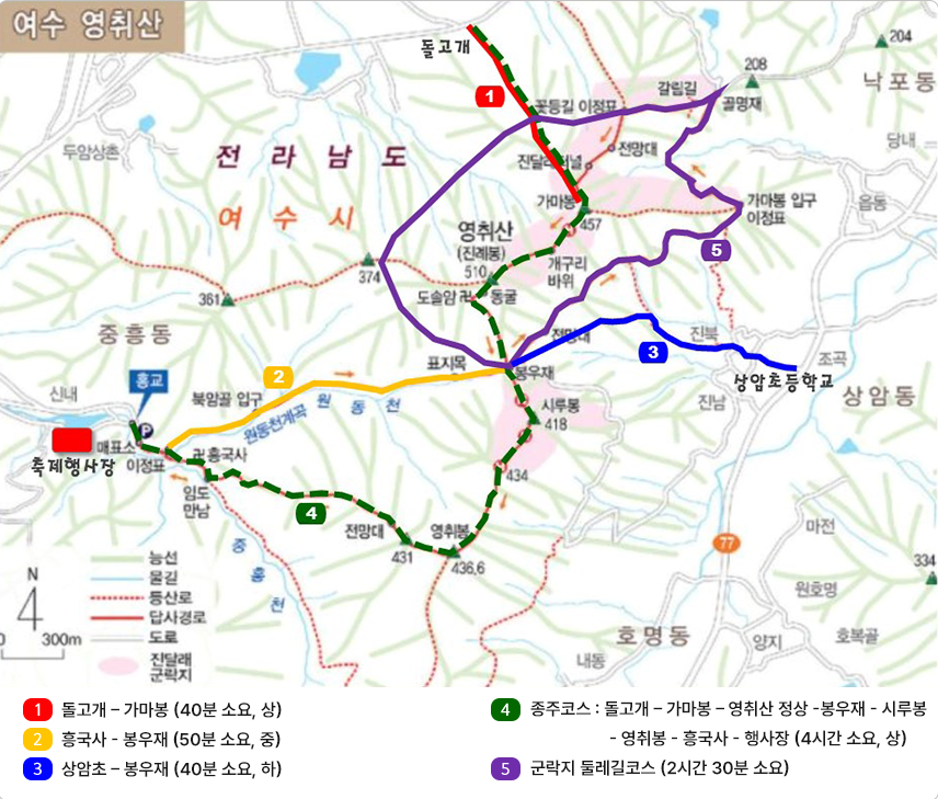 👥 가족단위 추천: 상암초 → 450m 정상 → 봉우재 → 흥국사 하산