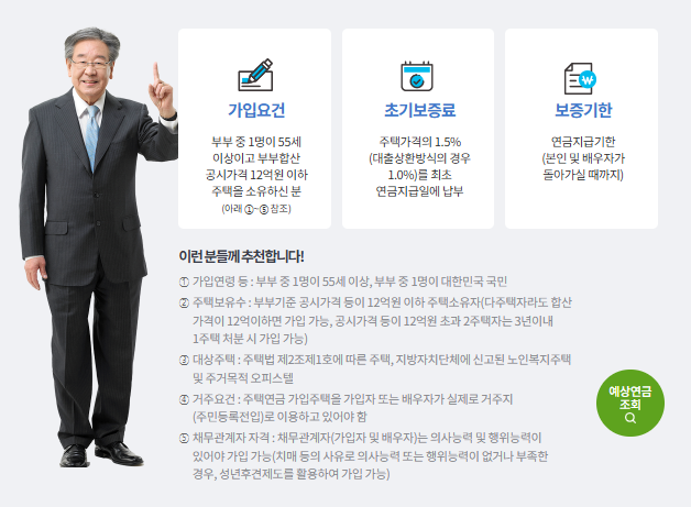 - 부부 기준 공시가격 등이 12억 원 이하의 주택만 가능 (다주택자로 합산가격이 12억 원 이하면 가입 가능)