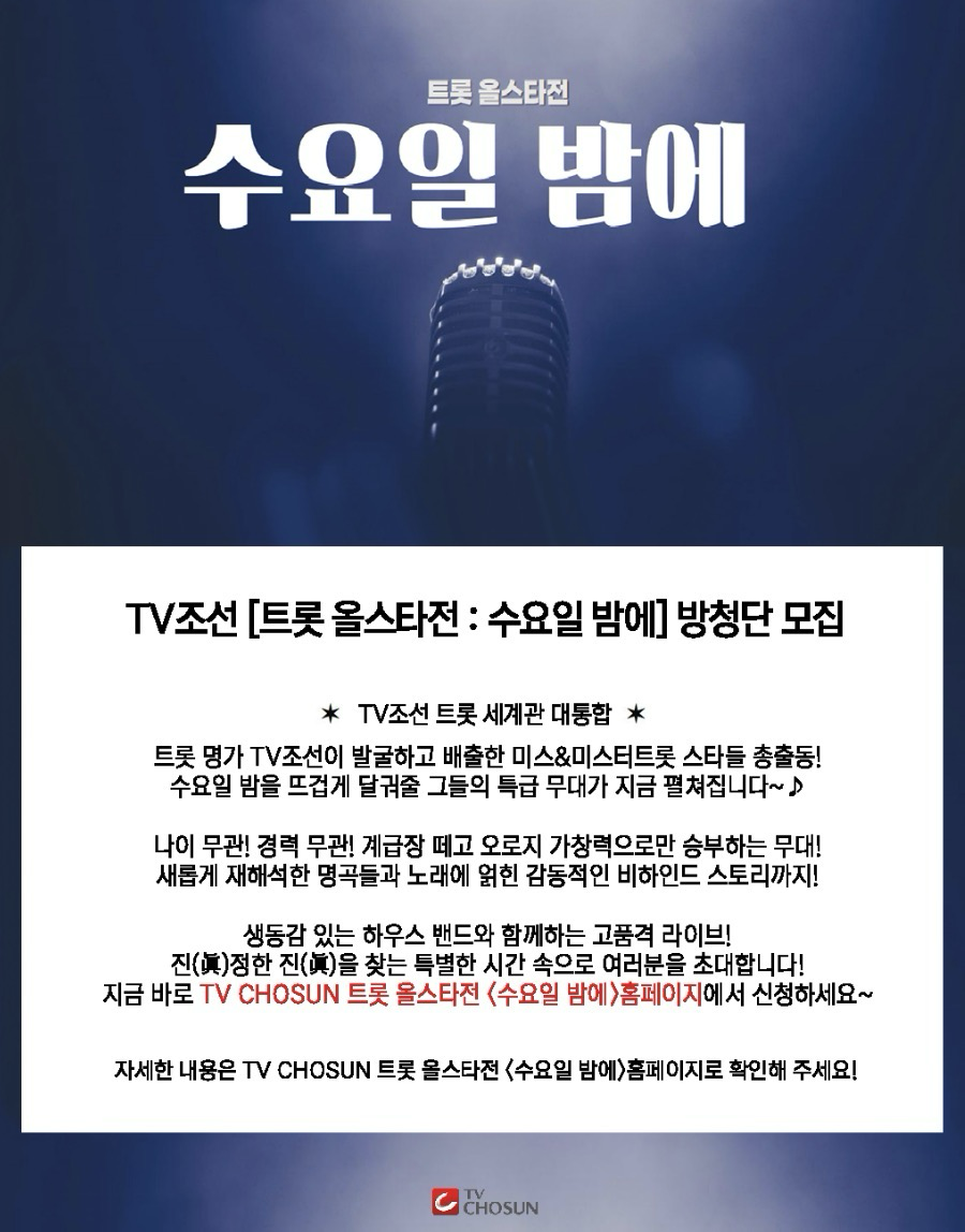 트롯 올스타전: 수요일 밤에는 방청객과 함께하는 공개 녹화로 진행돼요. 트롯 올스타전 방청신청을 통해 현장에서 트롯 스타들의 무대를 감상하고 싶다면 아래 절차를 따라 주세요.