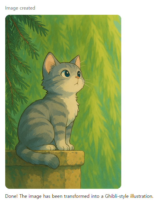 이렇게만 입력해도 챗GPT 지브리 스타일로 멋진 결과물을 받아볼 수 있습니다. 정말 쉽죠?
