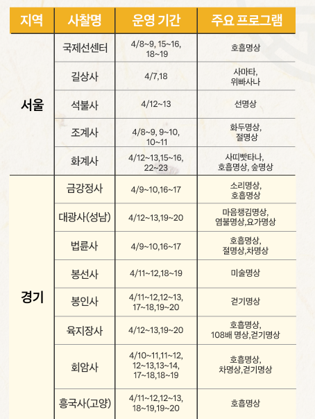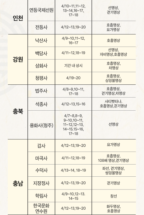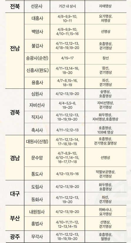 | 전남 | 불갑사, 송광사, 신흥사 | 자비선, 참선, 걷기명상 |