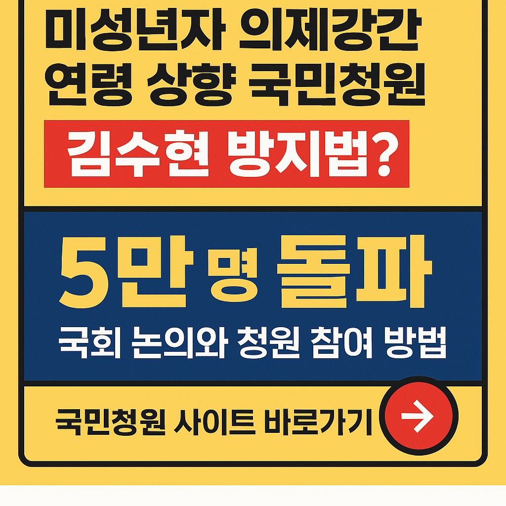 안녕하세요, 케이피입니다! 최근 국회 전자청원 게시판에 올라온 ‘미성년자 의제강간 연령 상향 및 처벌 강화 법안’, 일명 ‘김수현 방지법’ 청원이 5만 명을 돌파하며 화제입니다. 하루 만에 1만 4천 명 이상의 동의를 얻은 이 청원은 미성년자 보호를 위한 법 개정 논의를 촉발하고 있습니다. 과연 어떤 내용인지, 어떻게 참여할 수 있는지 자세히 알아보겠습니다.