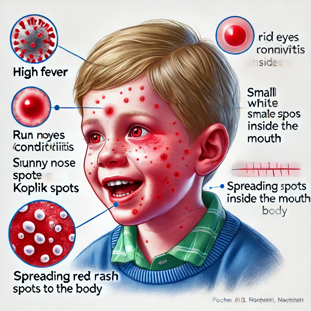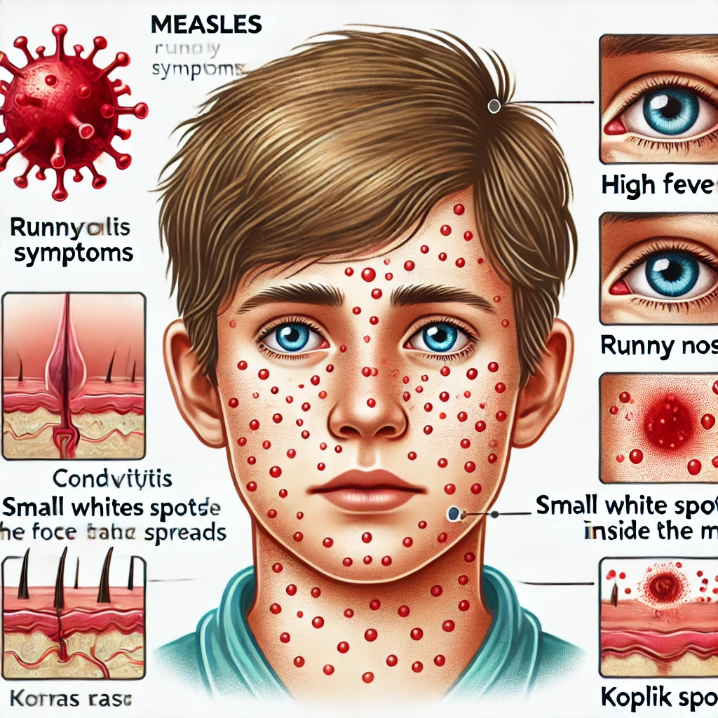 - 코플릭 반점: 입 안쪽 볼 점막에 작은 흰색 반점이 생김 (홍역의 특징적인 증상)