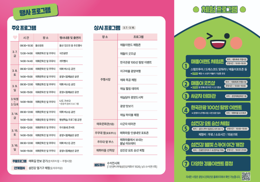 - 체험 행사: 매실청 담그기, 전통차 시음, 한복 체험
