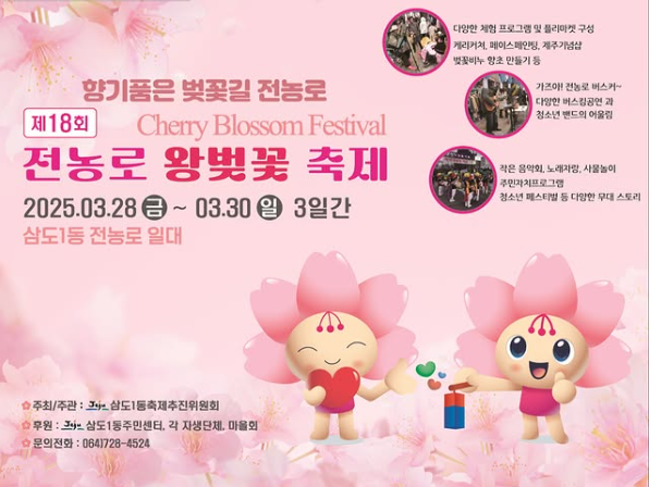 - 특징: 2005년부터 열린 자연생태 및 주민화합 축제. 왕벚꽃이 만개한 거리에서 약 6만 명이 즐기는 제주의 대표 벚꽃 행사.