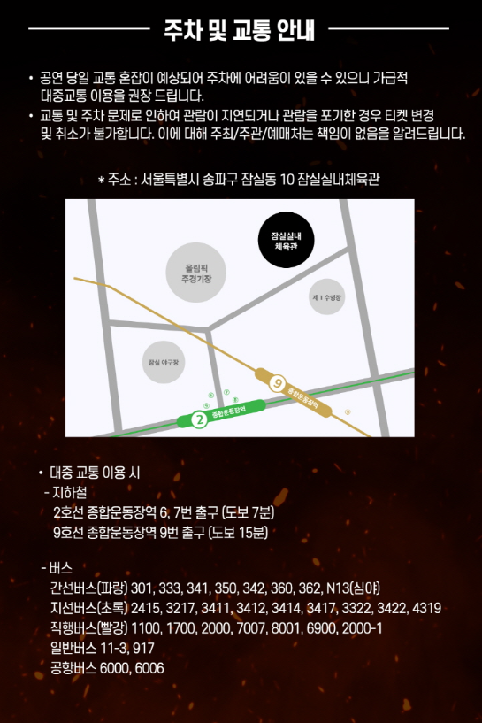 공연 당일 주차장이 혼잡할 수 있으므로 가급적 대중교통 이용을 권장합니다.