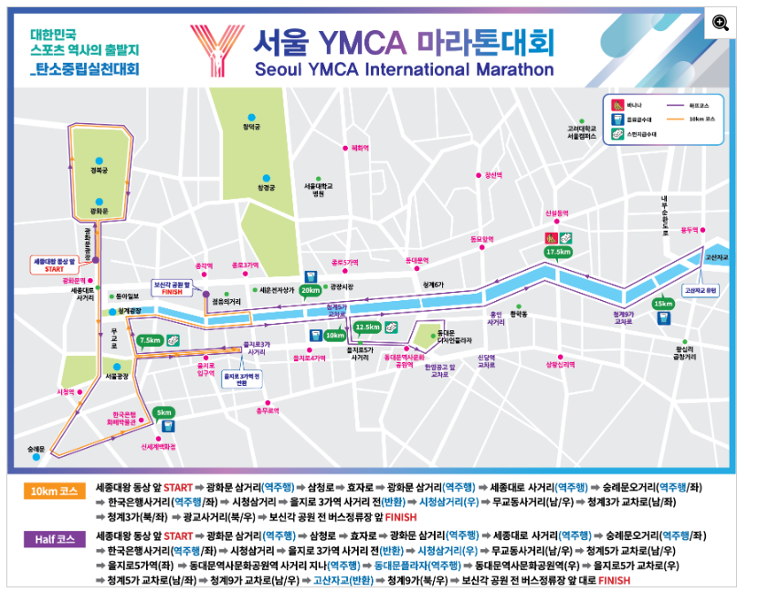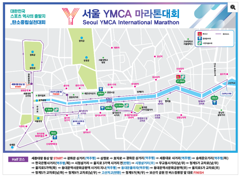 - 하프 마라톤 코스: 광화문 광장 출발 → 숭례문 오거리 → 시청 삼거리 → 을지로 → 무교동 사거리 → 동대문역사문화공원 → 청계천 → 보신각 도착