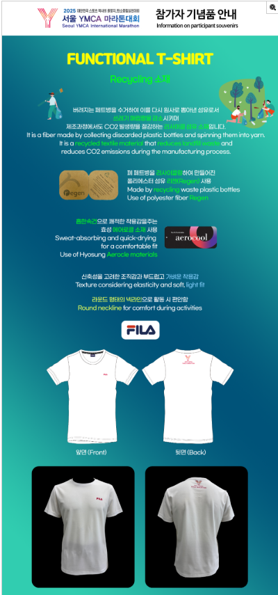 - 기념품: 리사이클 티셔츠, 양말, 리유저블 짐색, 배번호, 기록측정칩, 완주 메달.