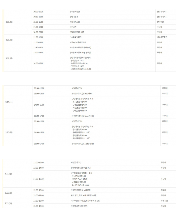 - 일정: 개막식 (3월 15일 오후 6시, 주행사장).