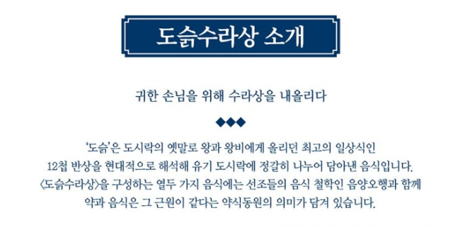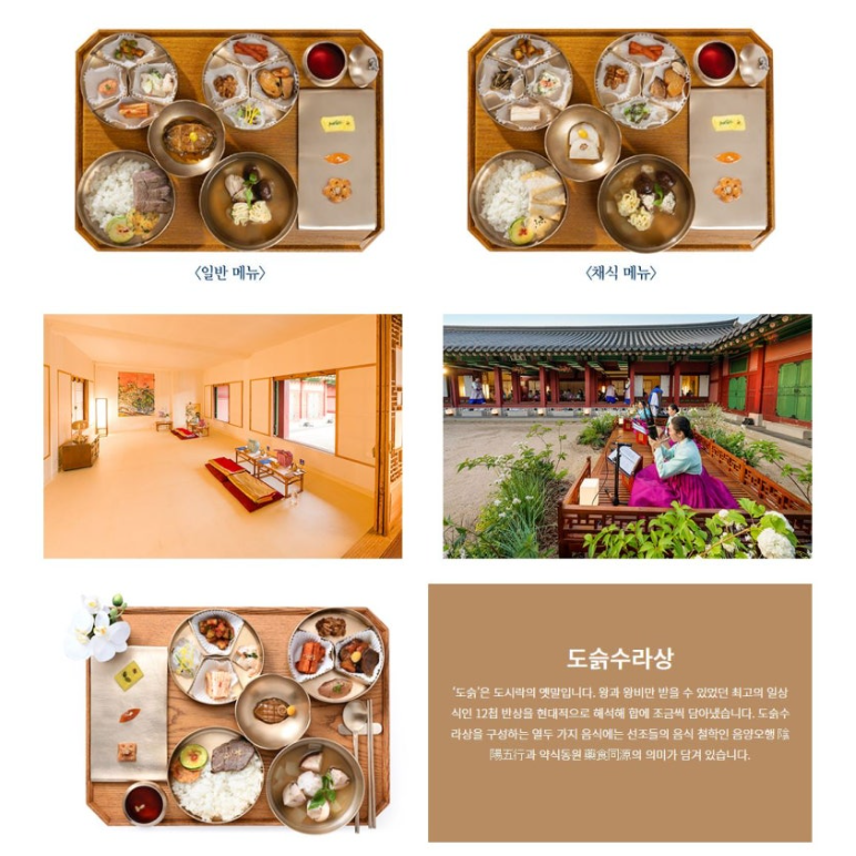 - 내용: 12첩 반상을 현대적으로 재해석한 수라상 제공.