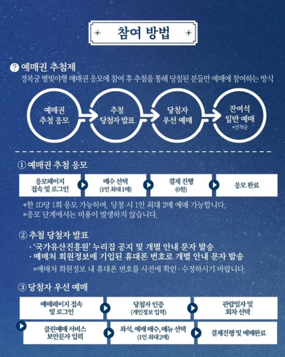 경복궁별빛야행은 사전 예약제로 운영됩니다. 2025년 상반기 예매 일정은 다음과 같습니다.