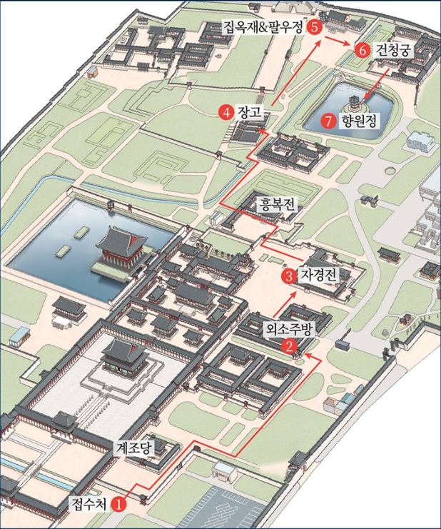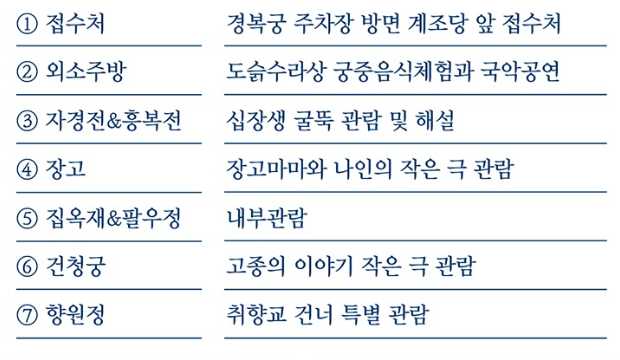- 경로: 외소주방 → 자경전 → 장고 → 집옥재·팔우정 → 건청궁 → 향원정.