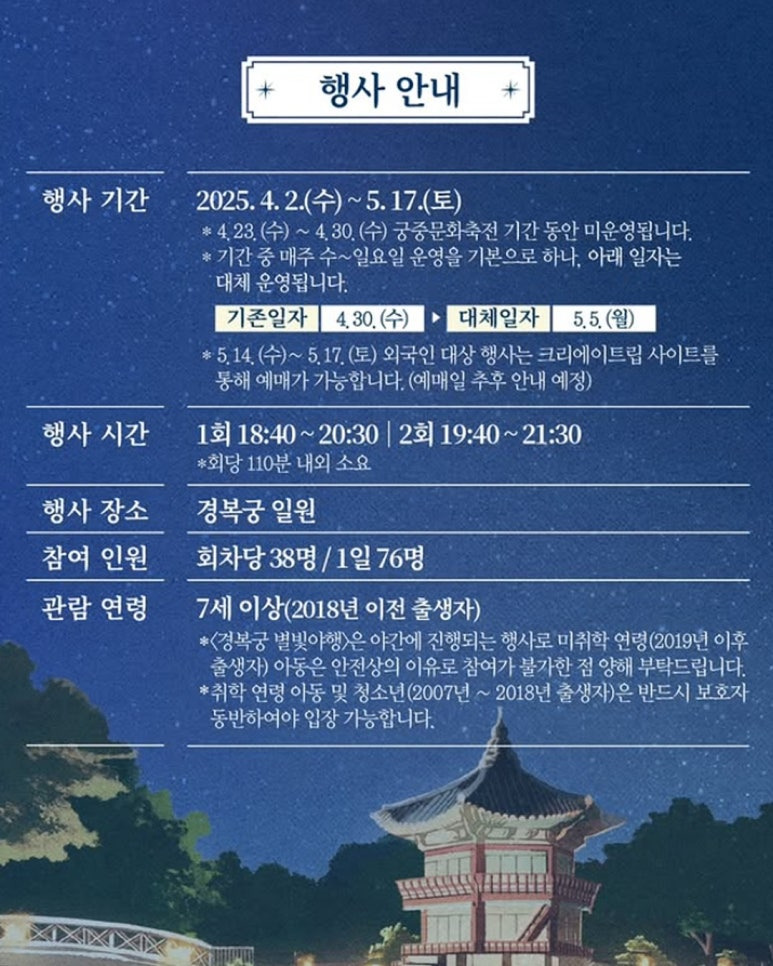 2025년 상반기 경복궁별빛야행 일정은 다음과 같습니다.
