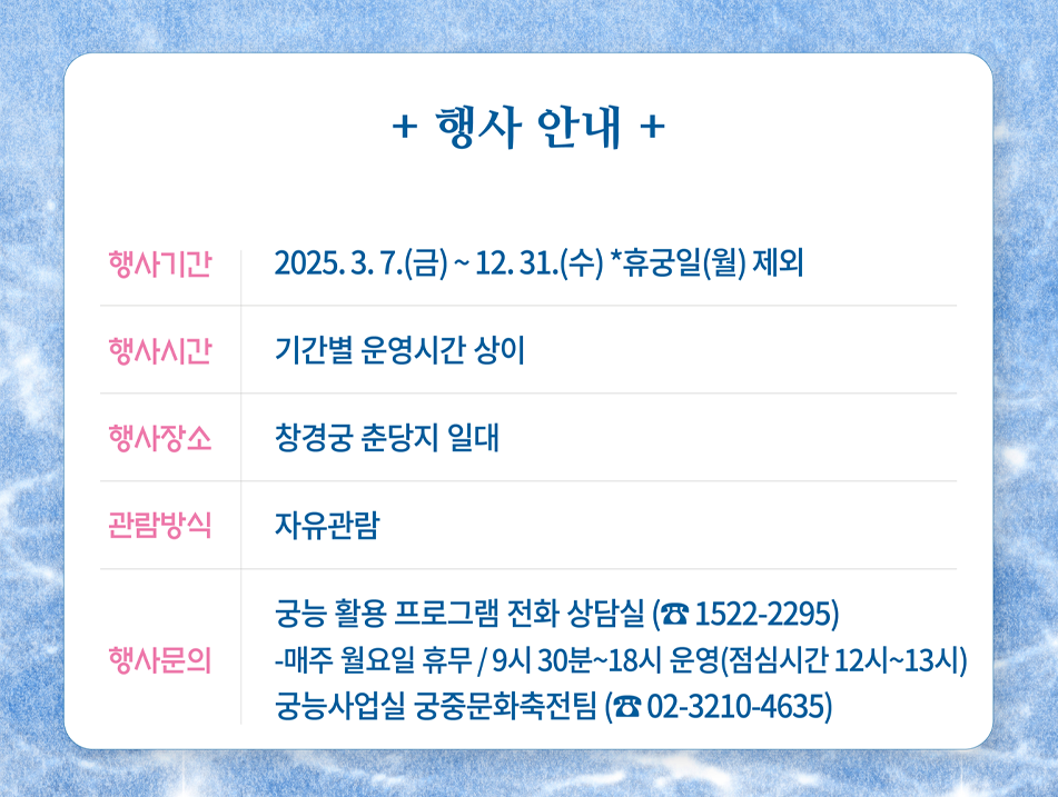 - 장소: 창경궁 춘당지 일대 (서울 종로구 창경궁로 185).