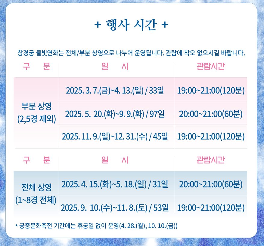 물빛연화는 부분 상영(2경, 5경 제외)과 전체 상영(1~8경)으로 나뉘며, 기간별 시간이 다릅니다.